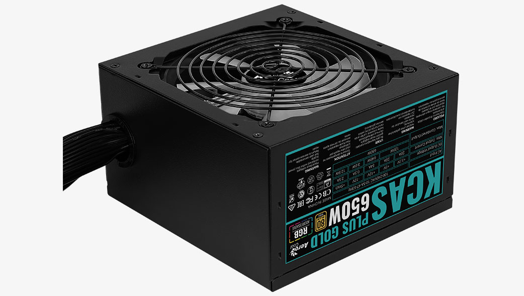 Aerocool KCAS PLUS GOLD 650W. Total power: 650 W, AC input voltage: 100 – 240 V, AC input frequency: 47 – 63 Hz. Motherboard power connector: 20+4 pin ATX, Cabling type: Non-Modular. Purpose: PC, 80 PLUS certification: 80 PLUS Gold. Product colour: Black, Fan diameter: 12 cm, Number of fans: 1 fan(s). Certification: ROHS
