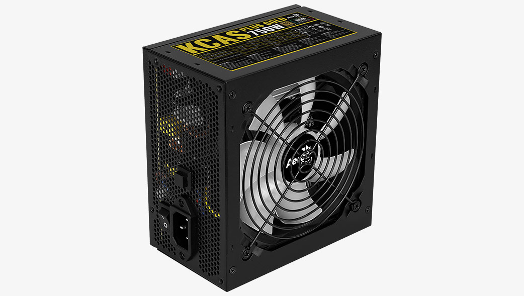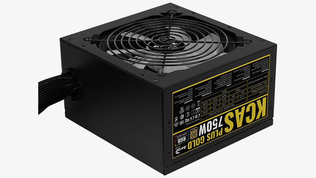 Aerocool KCAS PLUS GOLD 750W. Total power: 750 W, AC input voltage: 100 – 240 V, AC input frequency: 47 – 63 Hz. Motherboard power connector: 20+4 pin ATX, Cabling type: Non-Modular. Purpose: PC, 80 PLUS certification: 80 PLUS Gold. Product colour: Black, Fan diameter: 12 cm, Number of fans: 1 fan(s). Certification: ROHS