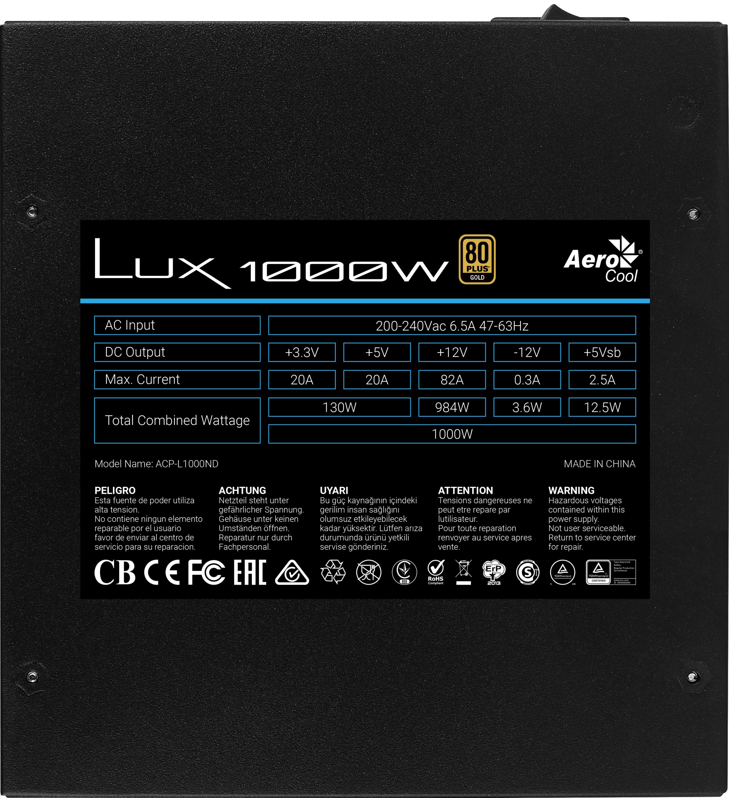 Aerocool LUX. Total power: 1000 W, AC input voltage: 200 – 240 V, AC input frequency: 47 – 63 Hz. Motherboard power connector: 20+4 pin ATX, Cabling type: Non-Modular. Purpose: PC, Power supply unit (PSU) form factor: ATX, 80 PLUS certification: 80 PLUS Gold. Product colour: Black, Blue, Fan diameter: 12 cm, Number of fans: 1 fan(s). Package width: 195 mm, Package depth: 230 mm, Package height: 95 mm