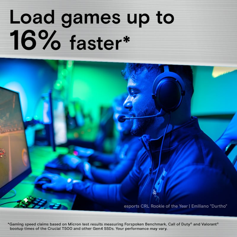 The Crucial T500 PCIe? Gen4 NVMe SSD will improve your gaming and content creation experience. The T500 is a game changer, designed for high-performance gaming, PS5 upgrades, and photo/video editing. With sequential read/write speeds of up to 7,300/6,800MB/s and random read/write speeds of up to 1.44M IOPs, you’ll be able to load games 16% faster and enjoy a 42% increase in content creation app performance.