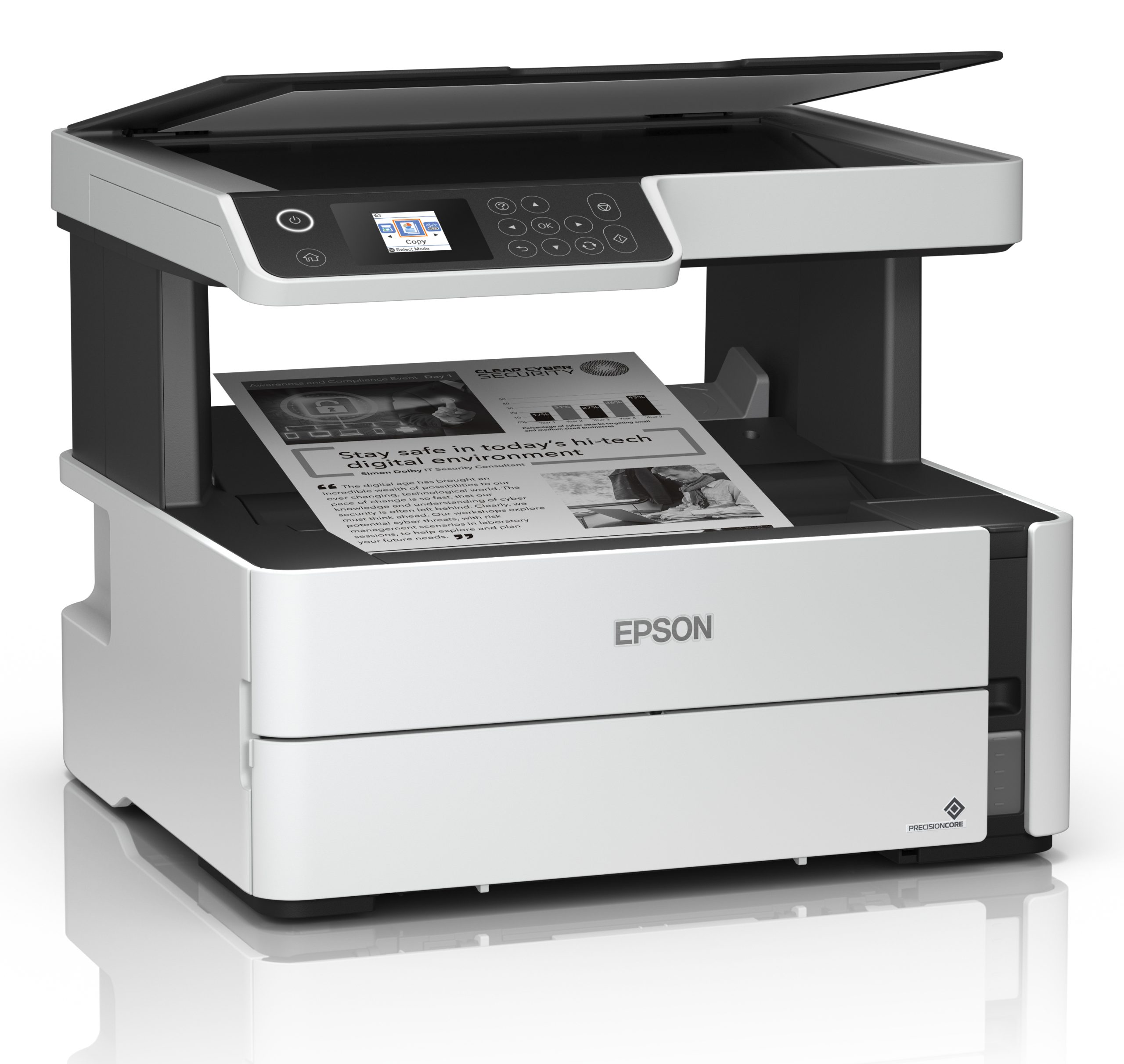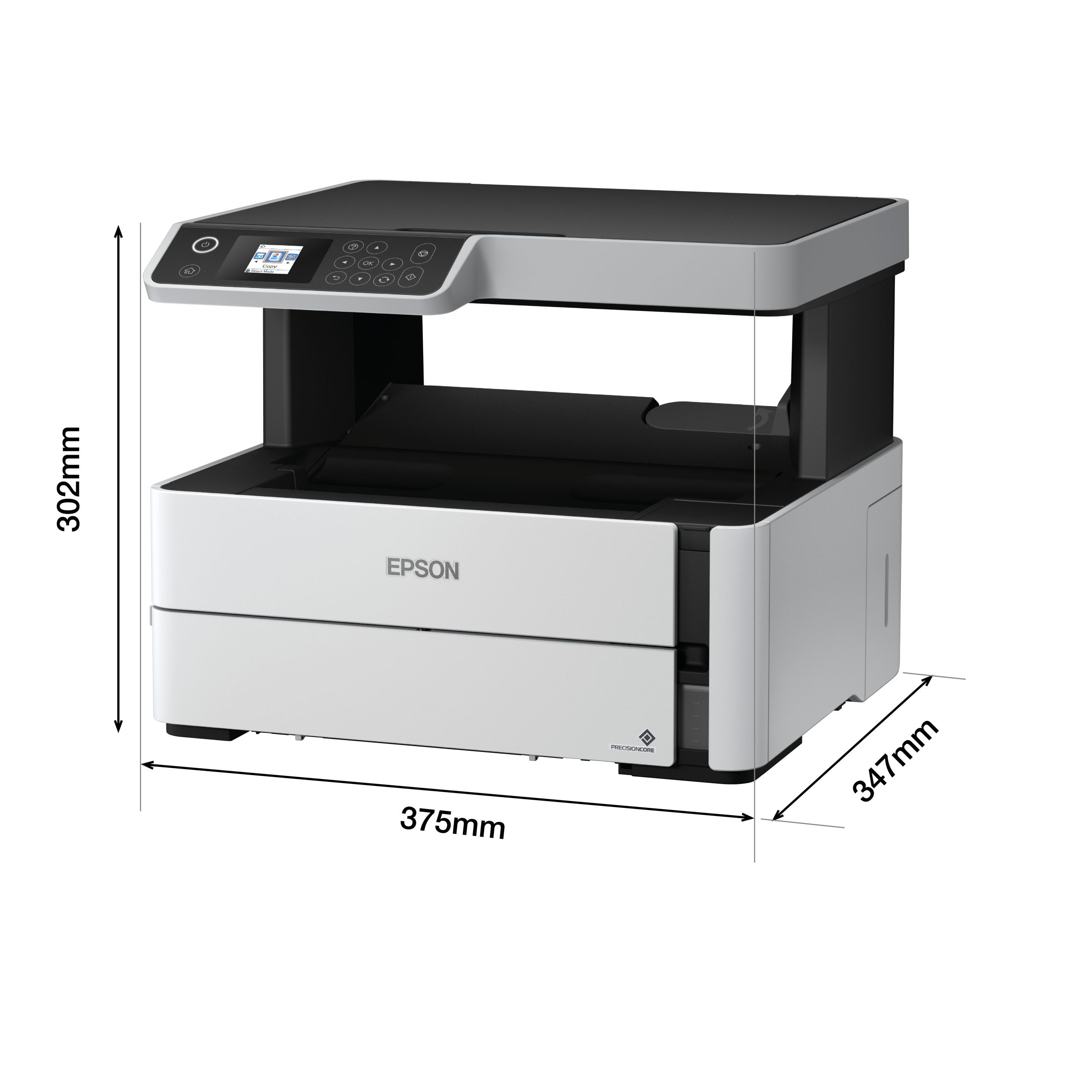 Epson EcoTank ET-M2170. Print technology: Inkjet, Printing: Mono printing, Resolution (maximum): 1200 x 2400 DPI. Copying: Mono copying, Maximum copy resolution: 1200 x 2400 DPI. Scanning: Colour scanning, Optical scanning resolution: 1200 x 2400 DPI. Maximum ISO A-series paper size: A4. Wi-Fi. Direct print supported. Product colour: Black, Grey, White