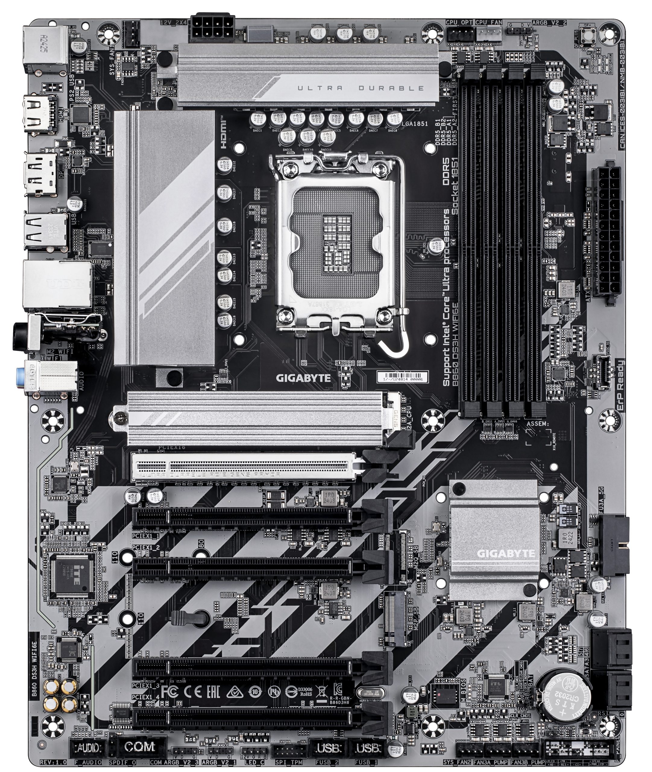 GIGABYTE B860 DS3H WIFI6E. Processor manufacturer: Intel, Processor socket: LGA 1851 (Socket V1), Compatible processor series: Intel Core Ultra (Series 2). Supported memory types: DDR5-SDRAM, Maximum memory: 256 GB, Memory slots type: DIMM. Supported storage drive interfaces: M.2, SATA III, Supported storage drive types: HDD & SSD, RAID levels: 0, 1, 5, 10. Maximum resolution: 4096 x 2160 pixels. Ethernet interface type: 2.5 Gigabit Ethernet, LAN controller: Realtek RTL8125, Top Wi-Fi standard: Wi-Fi 6E (802.11ax)