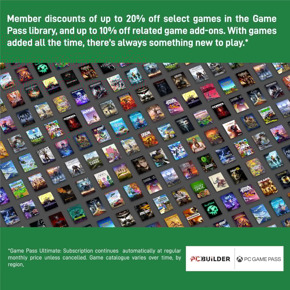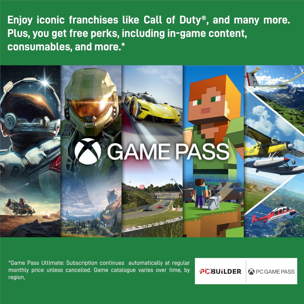 The PCBuilder DEFENDER Windows 11 Gaming PC also includes one month of PC Game Pass including EA Play. Play over 100 high-quality PC games, in various genres such as Halo Infinite, Forza Horizon 5, and Minecraft on your new gaming rig. With new games added all the time, there?s always something new to play from day one.