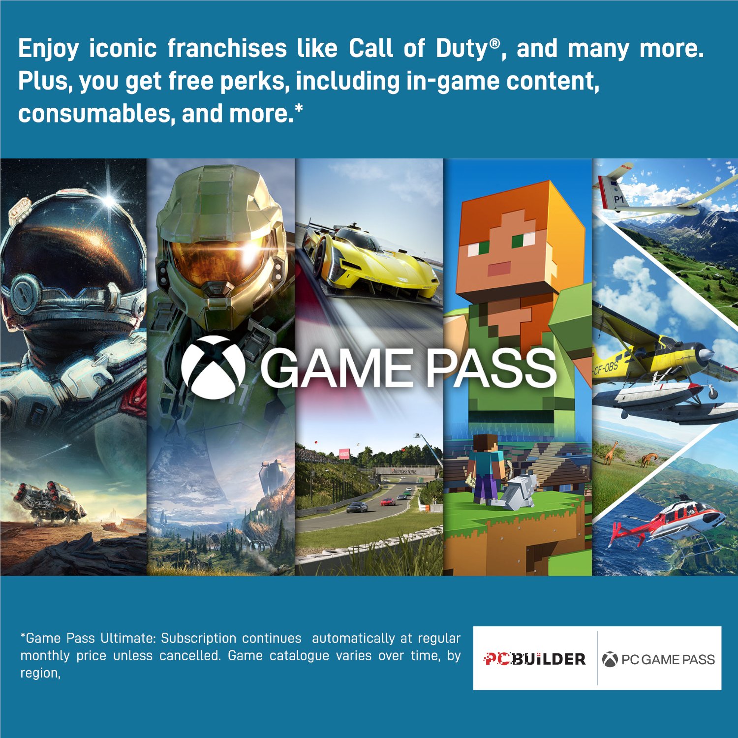 The PCBuilder OBLIVION Windows 11 Gaming PC also includes one month of PC Game Pass including EA Play. Play over 100 high-quality PC games, in various genres such as Halo Infinite, Forza Horizon 5, and Minecraft on your new gaming rig. With new games added all the time, there?s always something new to play from day one.