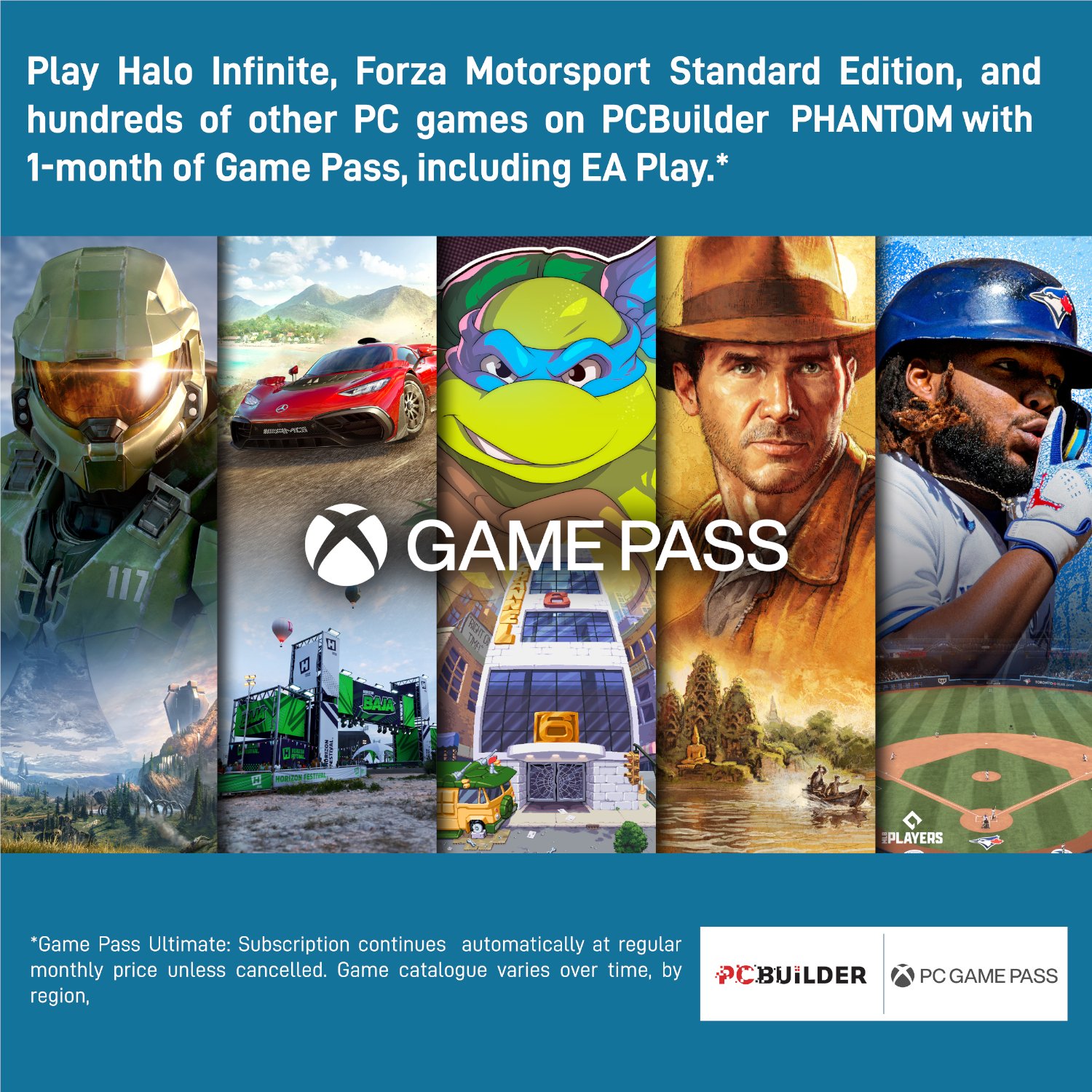 - Play over 100 high-quality PC games like Halo Infinite, Forza Horizon 5 and Teenage Mutant Ninja Turtles: Shredder?s Revenge with your new build and one month of PC Game Pass including EA Play. With new games being added all the time, there?s always something new to play from day one.?