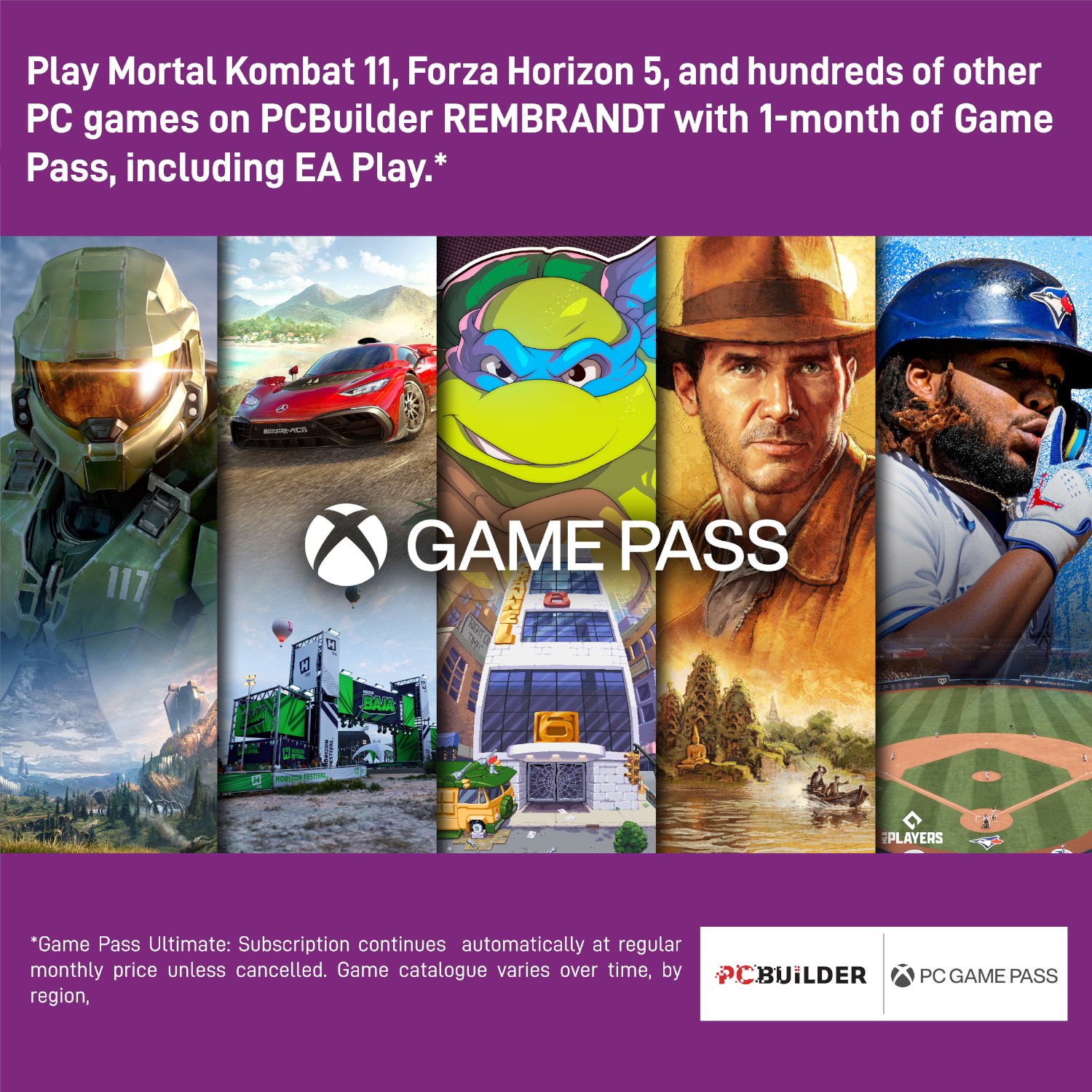 The PCBuilder REMBRANDT? Windows 11 Creator PC also includes one month of PC Game Pass, including EA Play. Play over 100 high-quality PC games, in various genres such as Halo Infinite, Forza Horizon 5, and Minecraft on your new gaming rig. With new games added all the time, there?s always something new to play from day one.