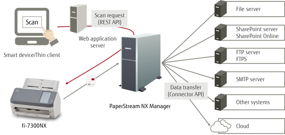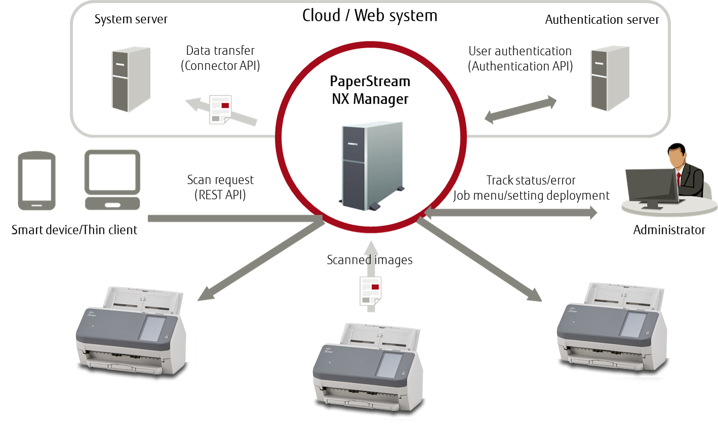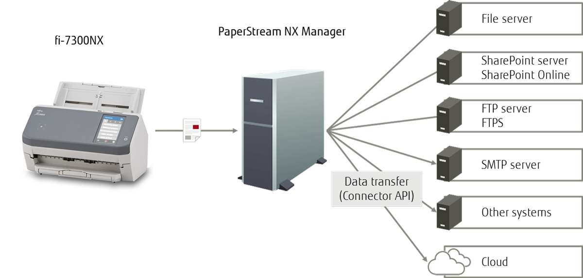 The fi-7300NX supports NFC (Type-A and Type-B) authentication and user authentication with username and password input on the touch screen. It is also possible for different job menus to be assigned to each scanner, and avoid any authentication processes. With PaperStream NX Manager, users can scan from mobile or web applications opened up on smart devices or thin client terminals. Seamless integration into company systems enables use of a variety of devices for scanning operations. The user authentication function, job menu, and other scan settings are all centrally managed with PaperStream NX Manager and Scanner Central Admin. With the fi-7300NX?s server software, there is no need for the conventional single client computer to scanner environment and the system administrator to stand by the scanner. This reduces the total burden of installation, expansion, operation, and management. Manage jobs and process images with PaperStream NX Manager. Monitor scanner operation with Scanner Central Admin.